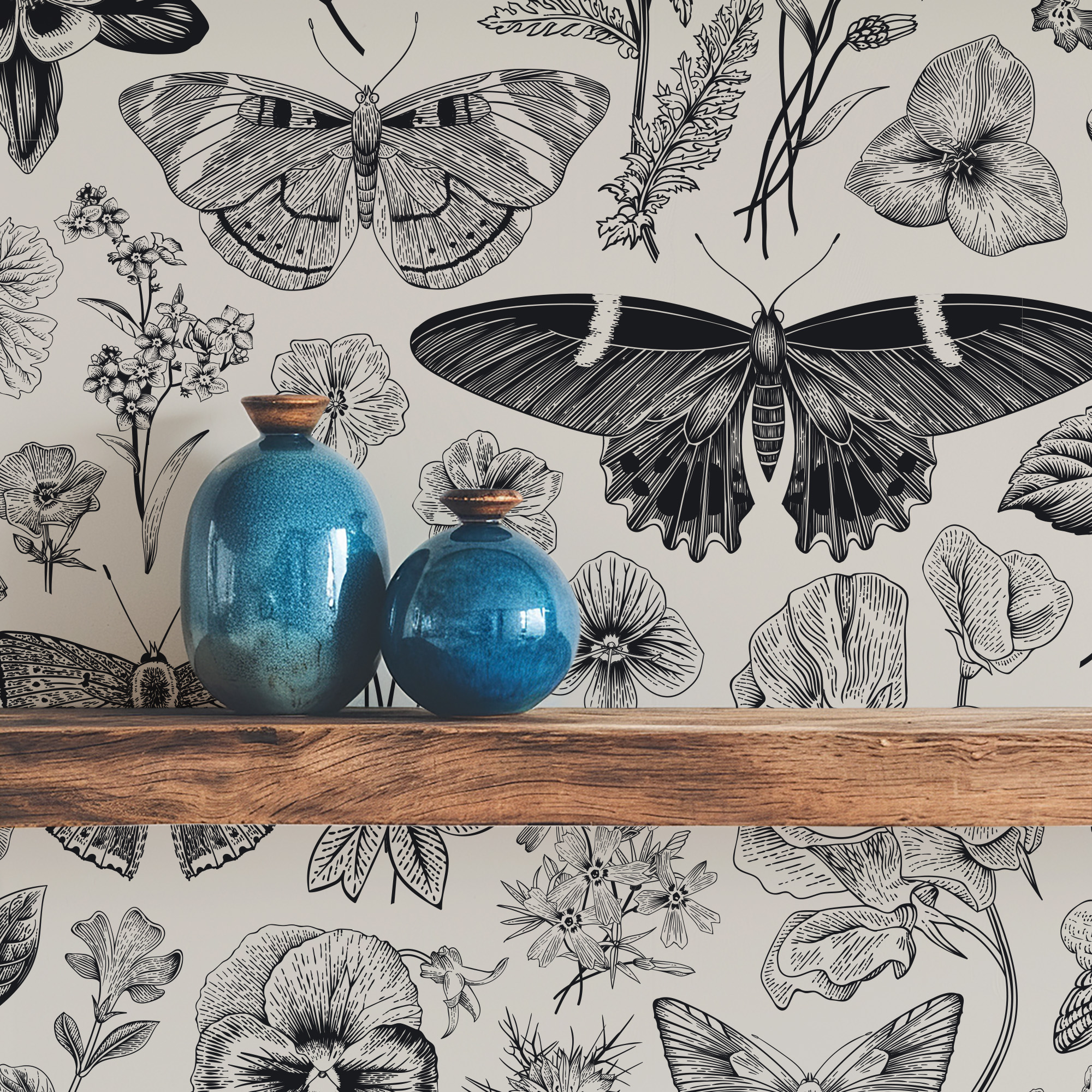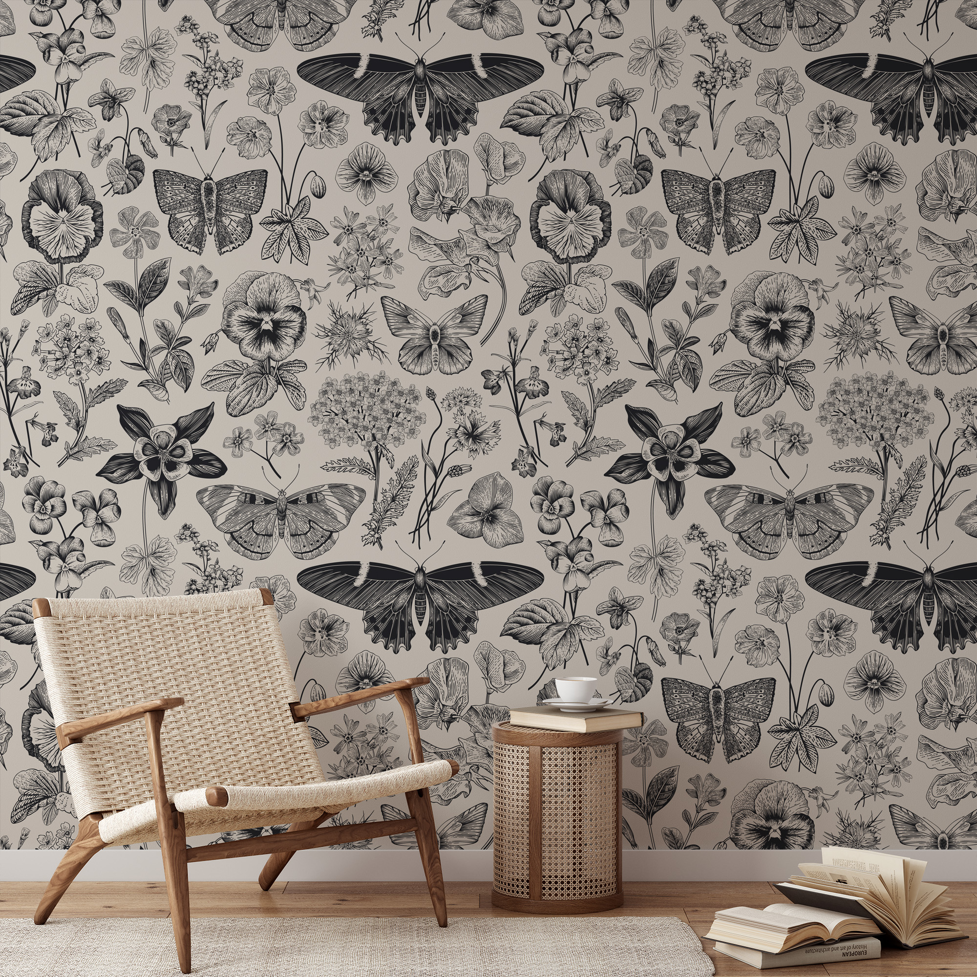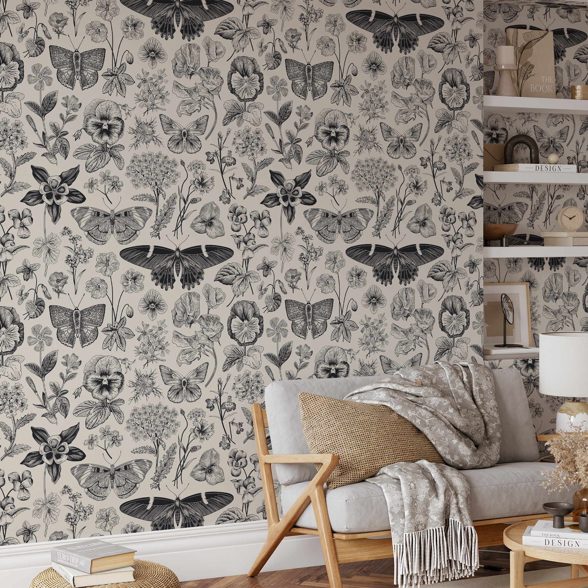 Vintage Botanical and Butterfly Sketch Peel and Stick Wallpaper, Black and White Meadow Floral Wall Mural, Retro Nature Wall Decor flrl-0008