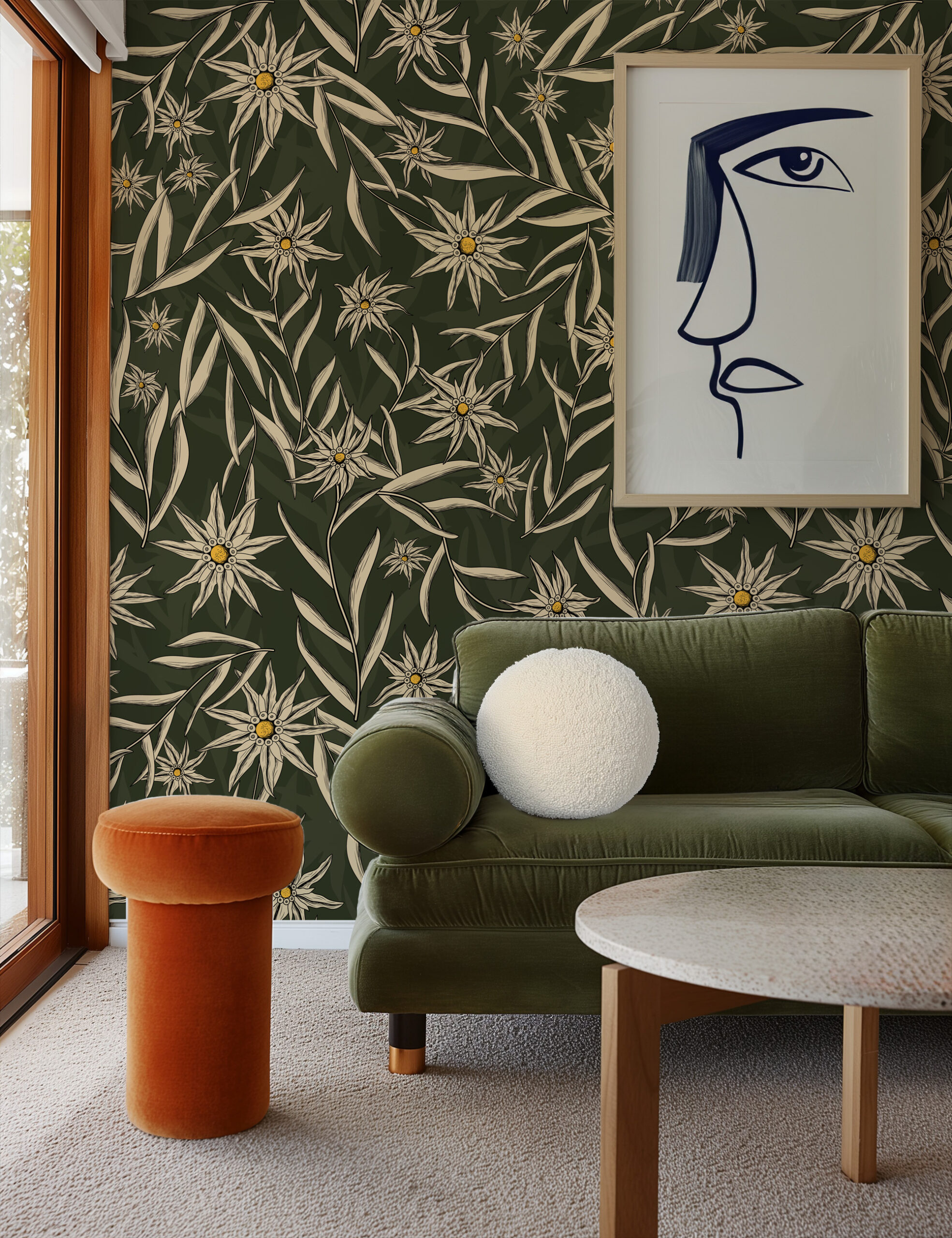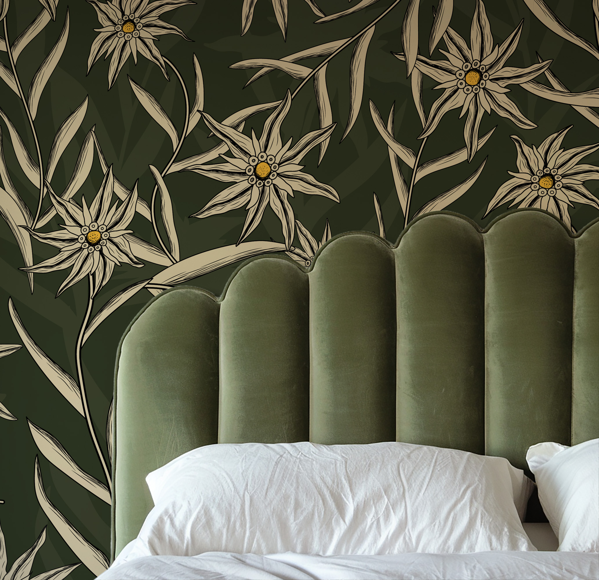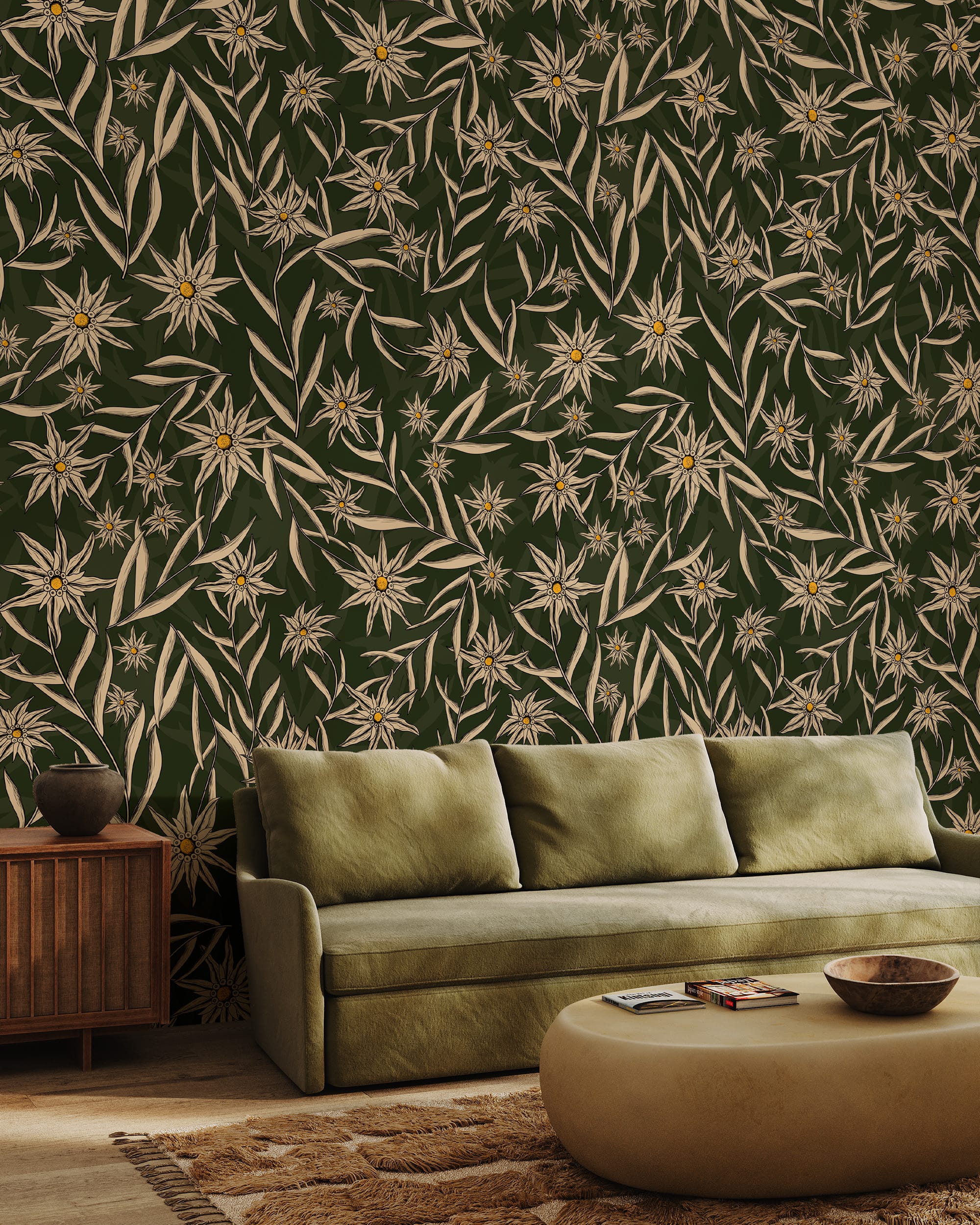 Vintage Dark Green Starflower Peel and Stick Wallpaper, Earthy Botanical Wall Mural, Retro Olive Green Floral Decor flrl-0023