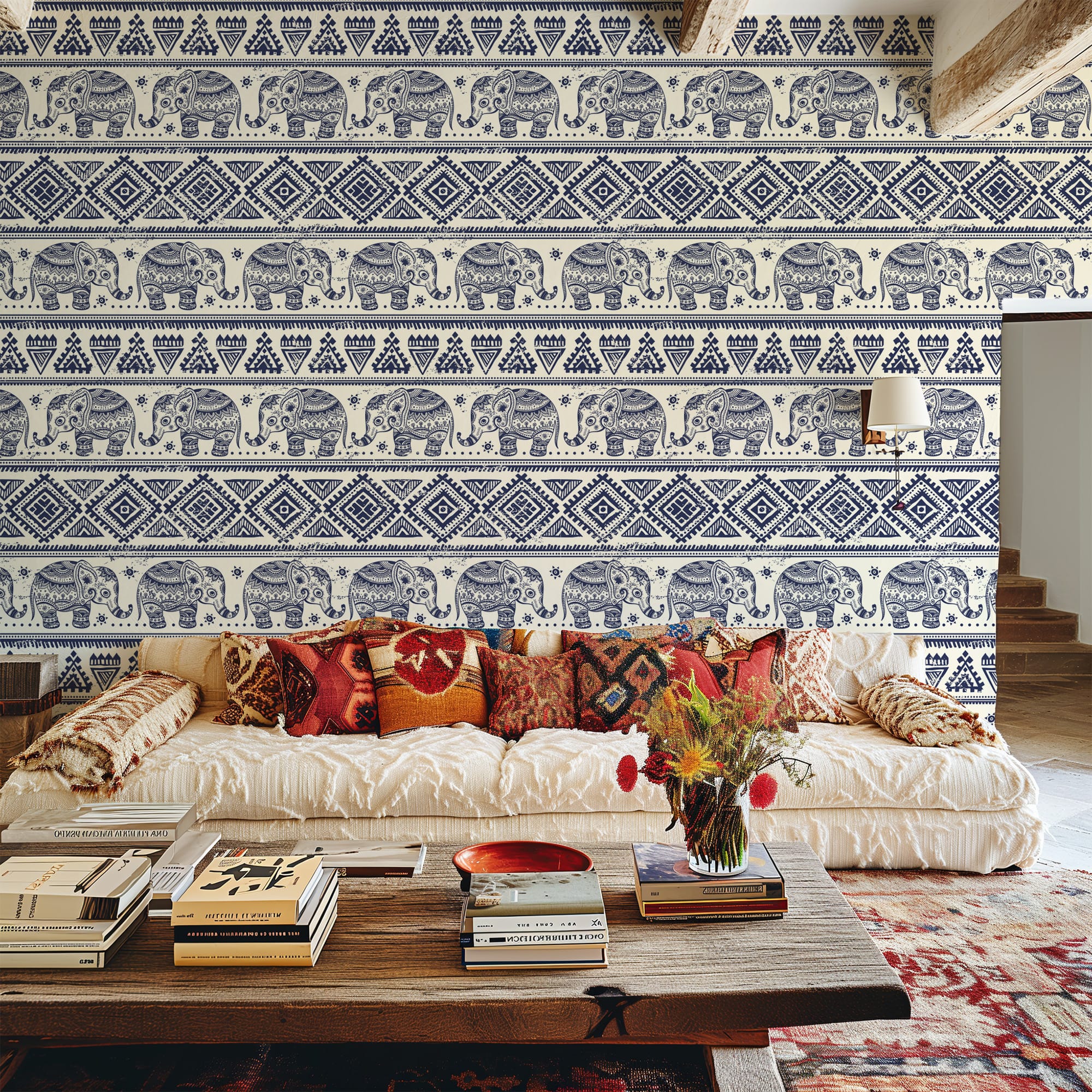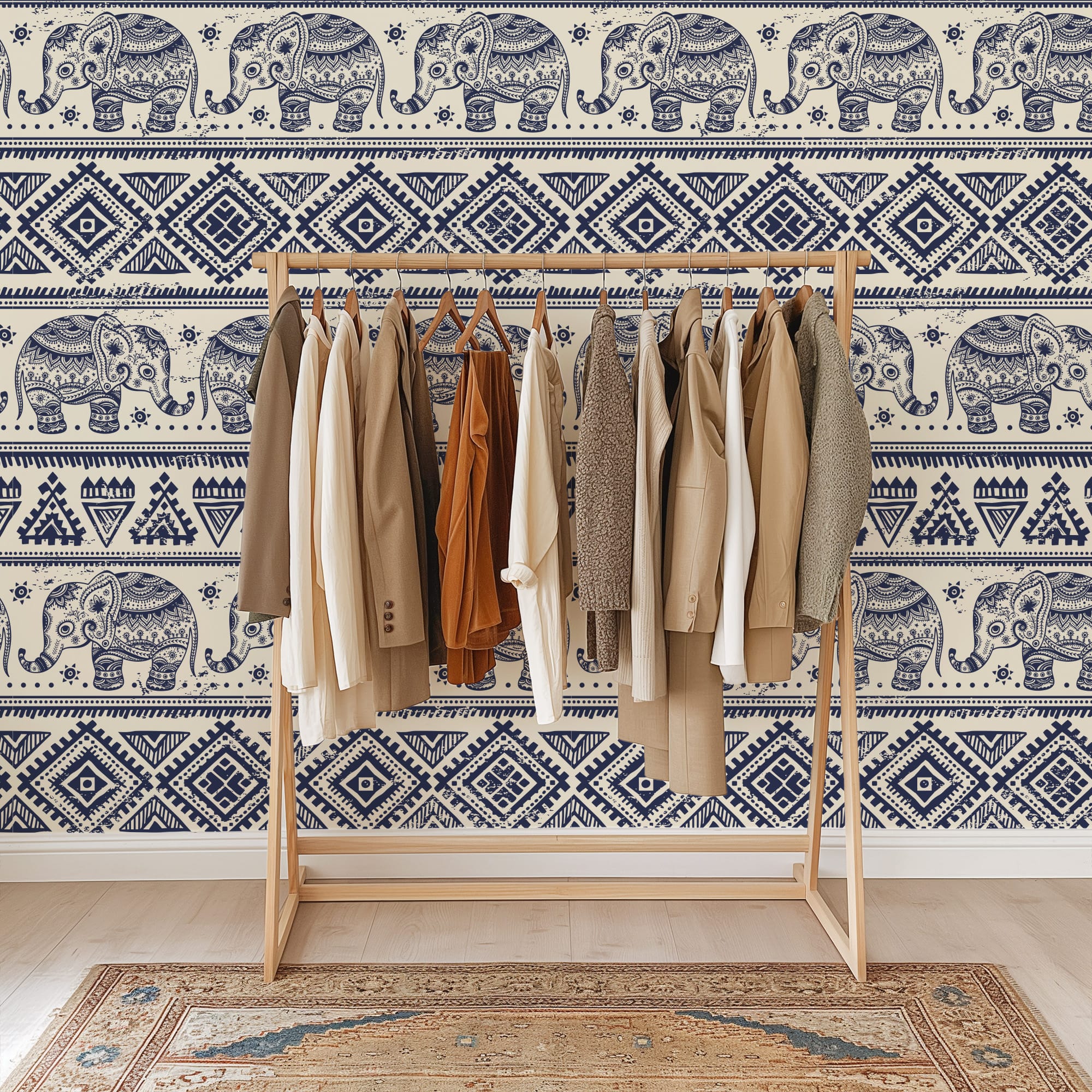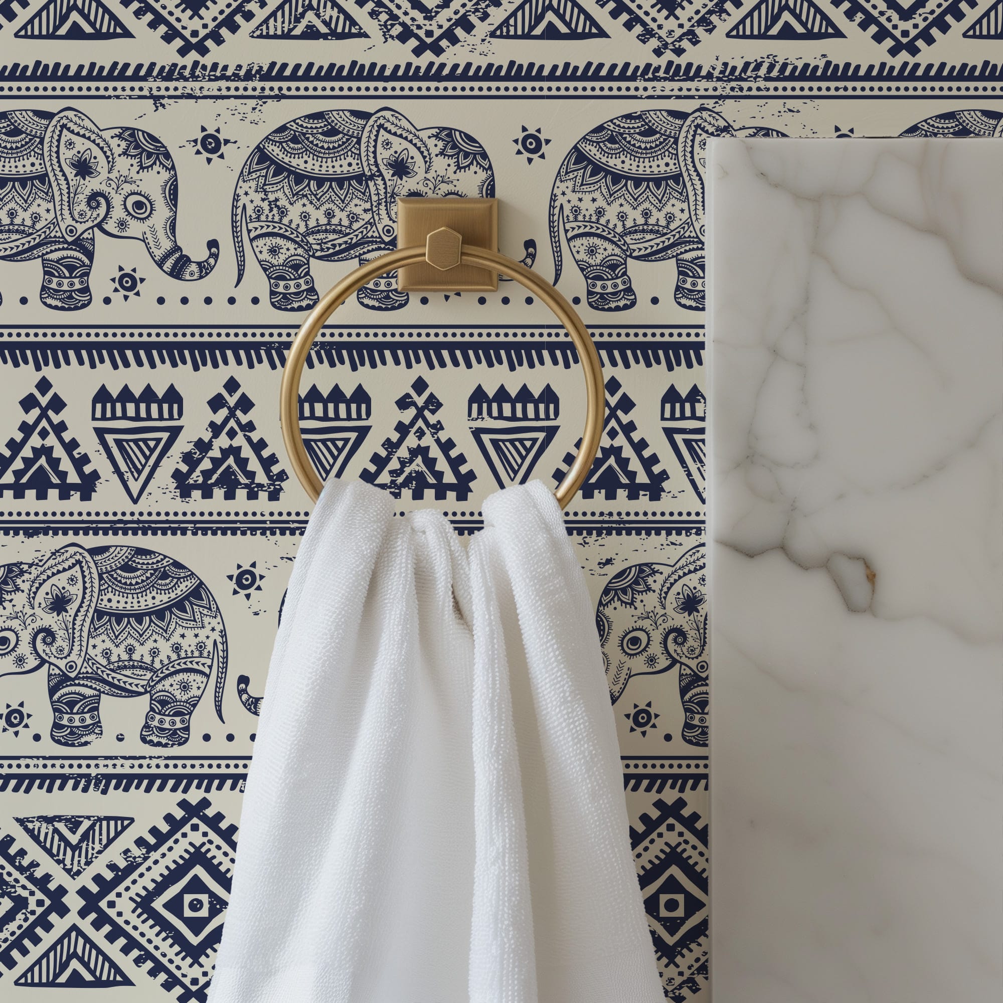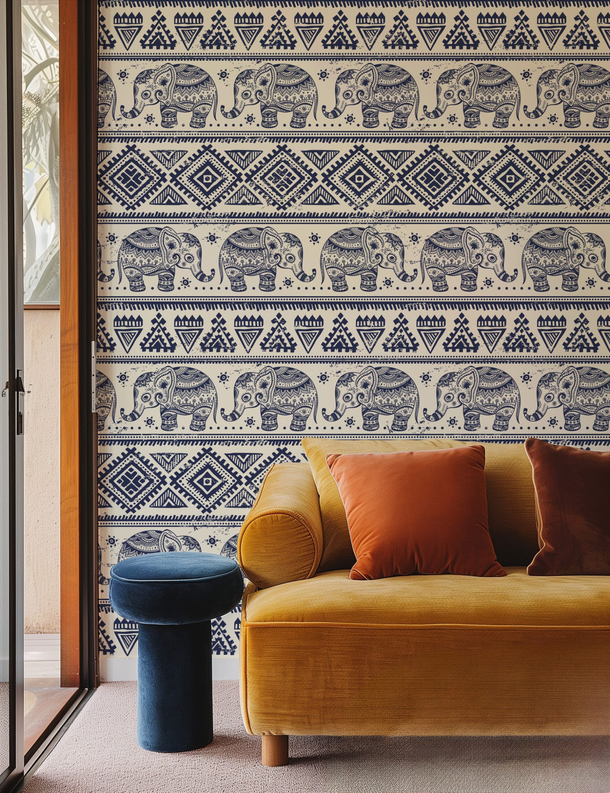 Vintage Navy Blue Elephant Tribal Peel and Stick Wallpaper, Ethnic Boho Geometric Wall Mural, Traditional Illustrated Removable Wallpaper anml-0004