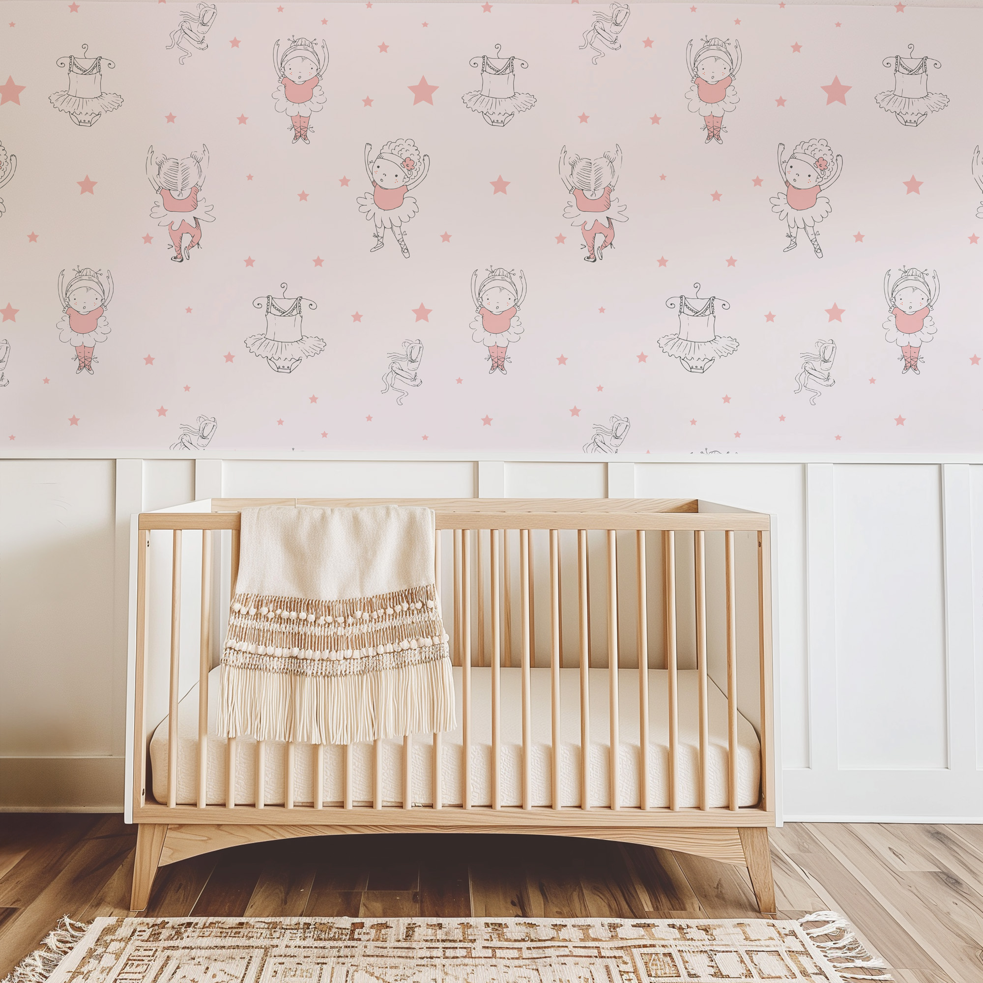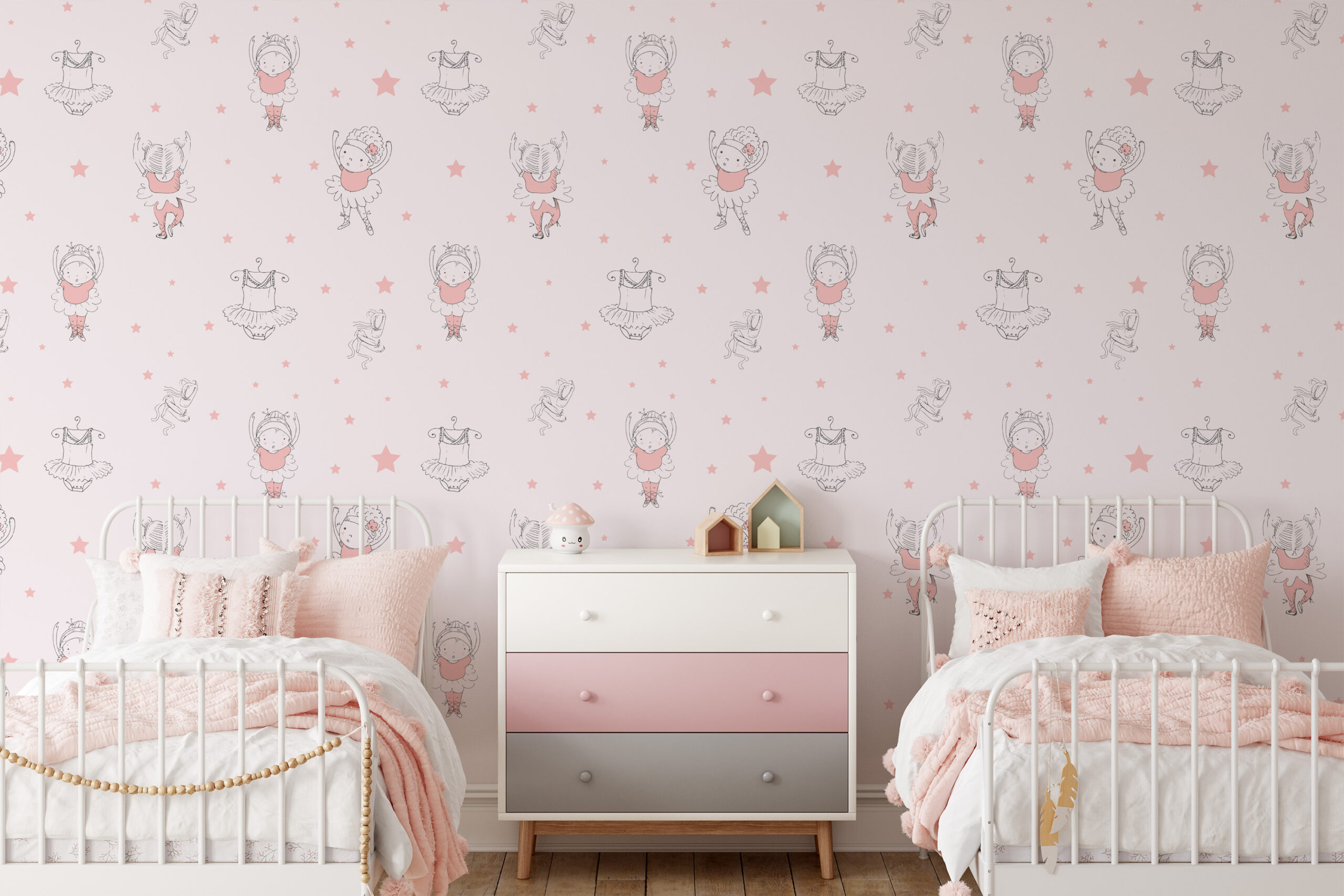 Watercolor Ballerina and Tutu Kids Peel and Stick Wallpaper, Soft Pink Ballet Nursery Wall Mural, Starry Dance Decor kids-0054