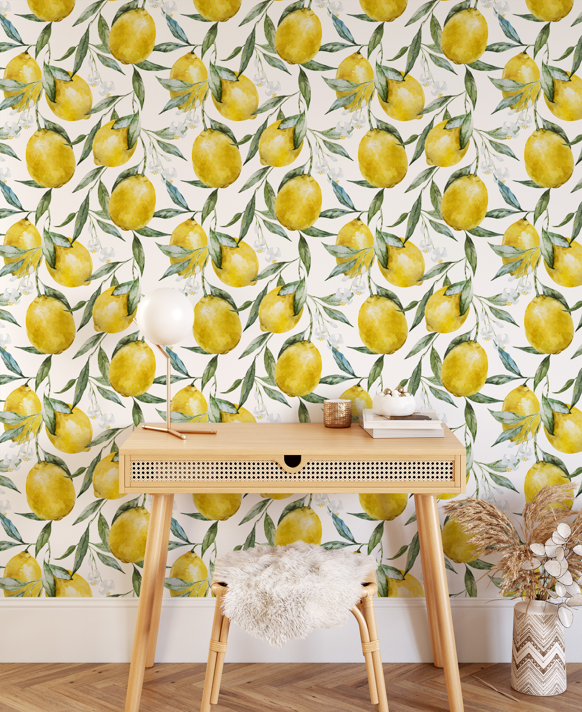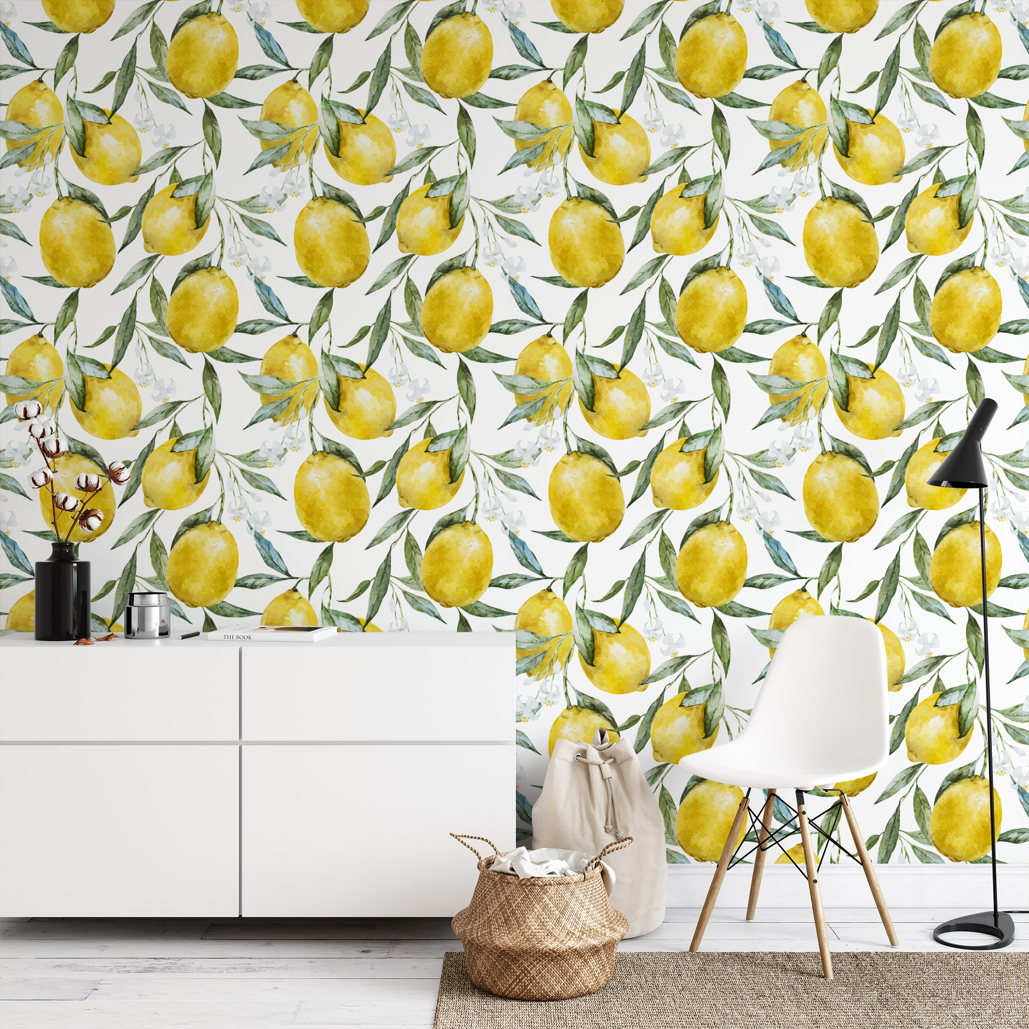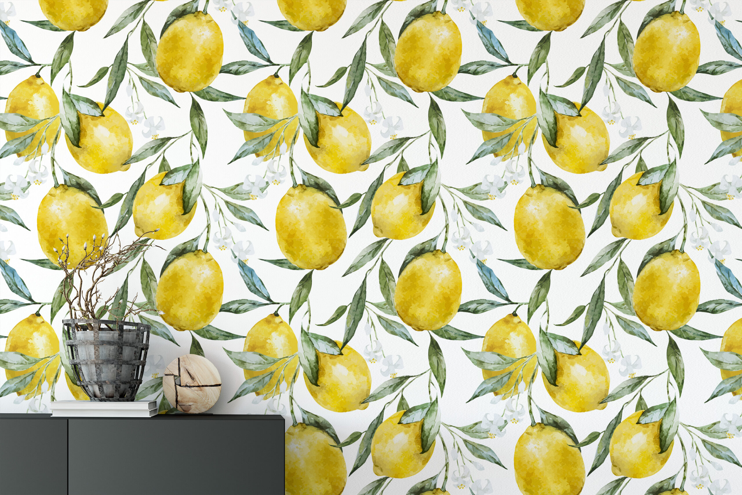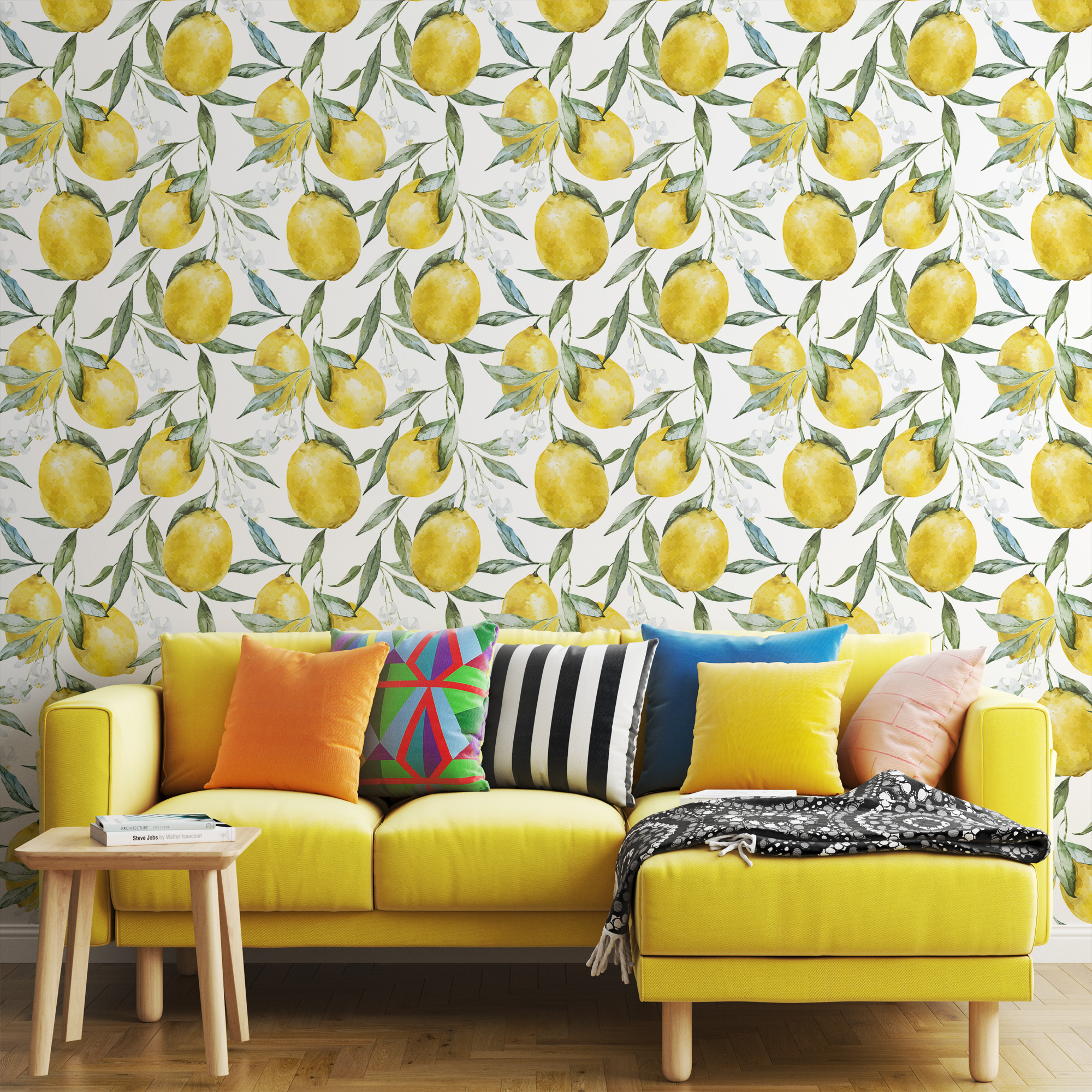 Watercolor Lemon Peel and Stick Wallpaper, Yellow Citrus Fruit Wall Mural, Fresh Botanical Mediterranean Decor flrl-0066
