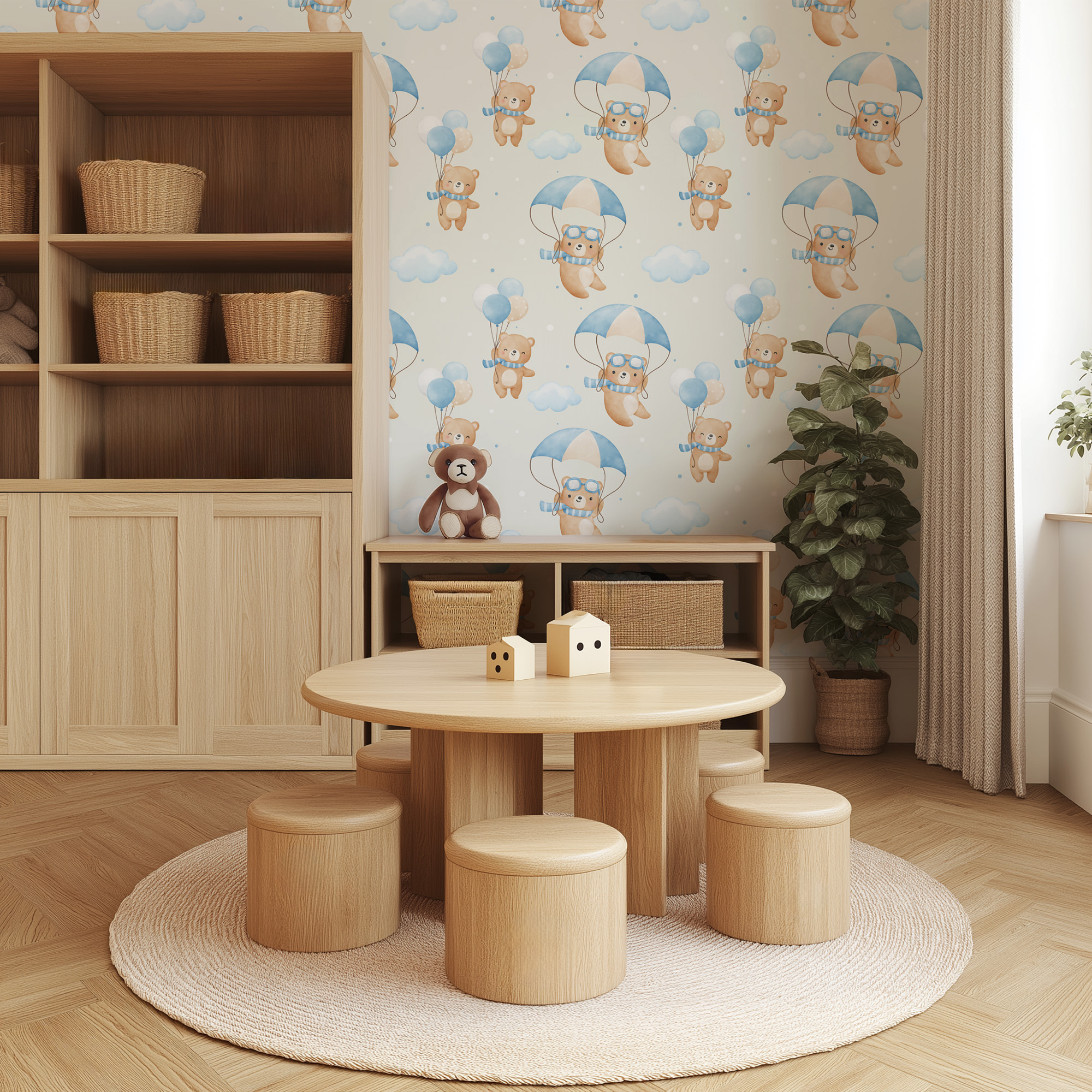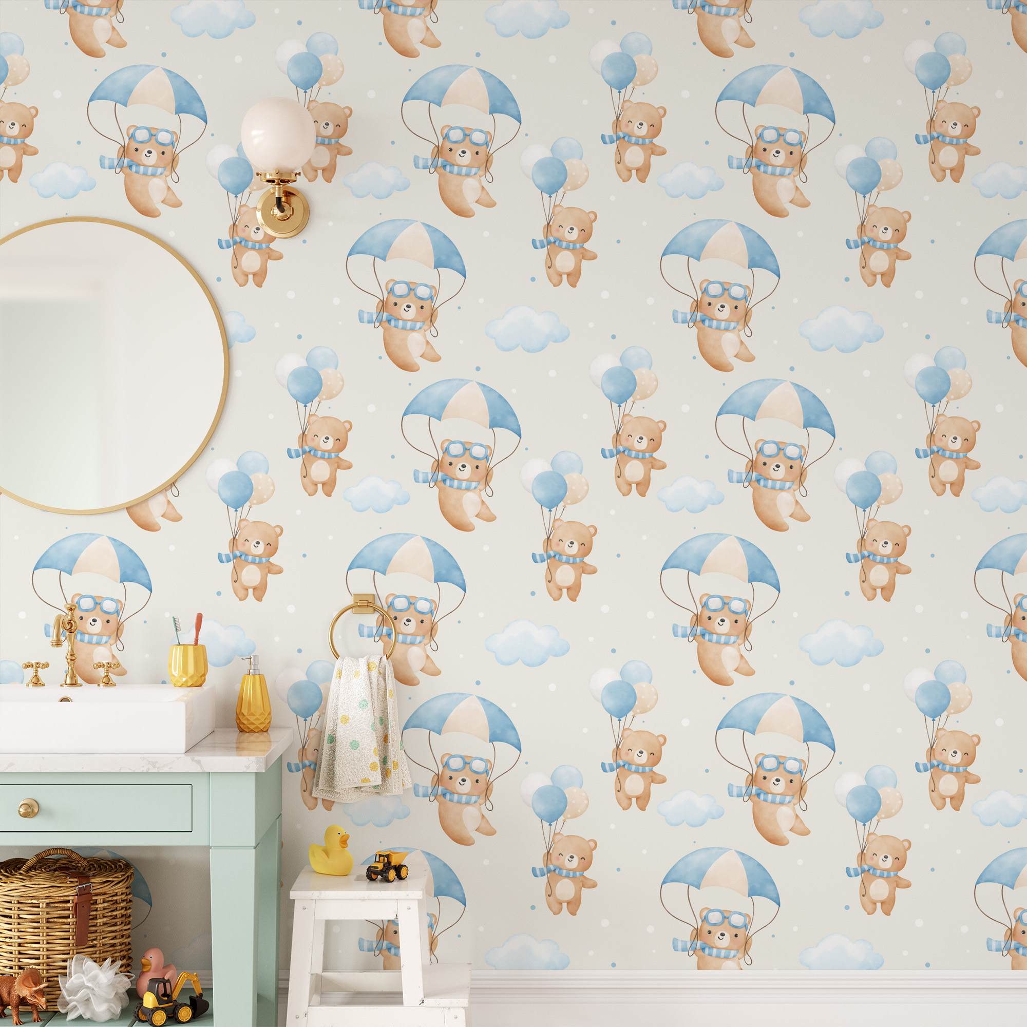 Watercolor Teddy Bear Aviator and Parachute Kids Peel and Stick Wallpaper, Blue Sky Nursery Wall Mural, Whimsical Baby Room Decor kids-0046