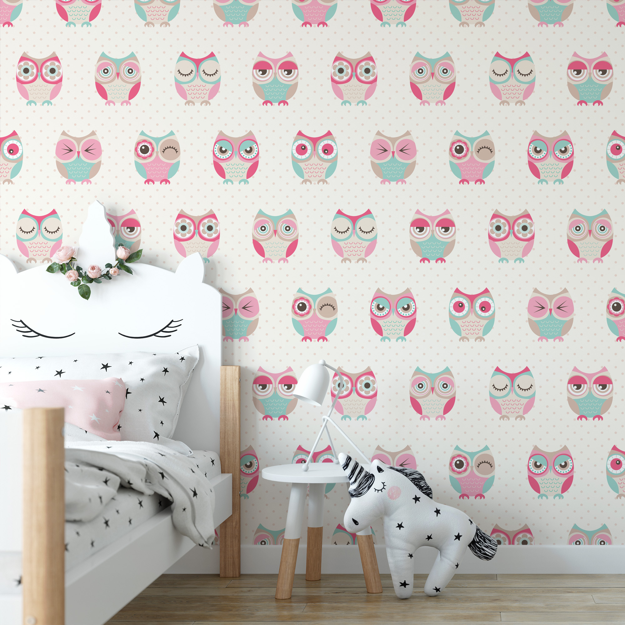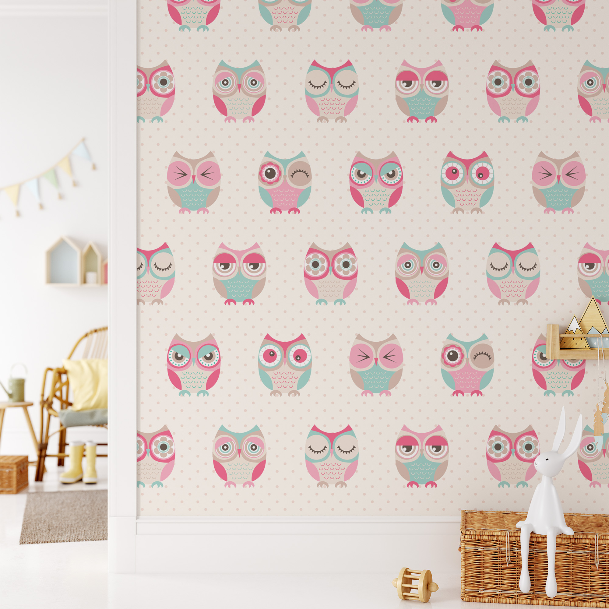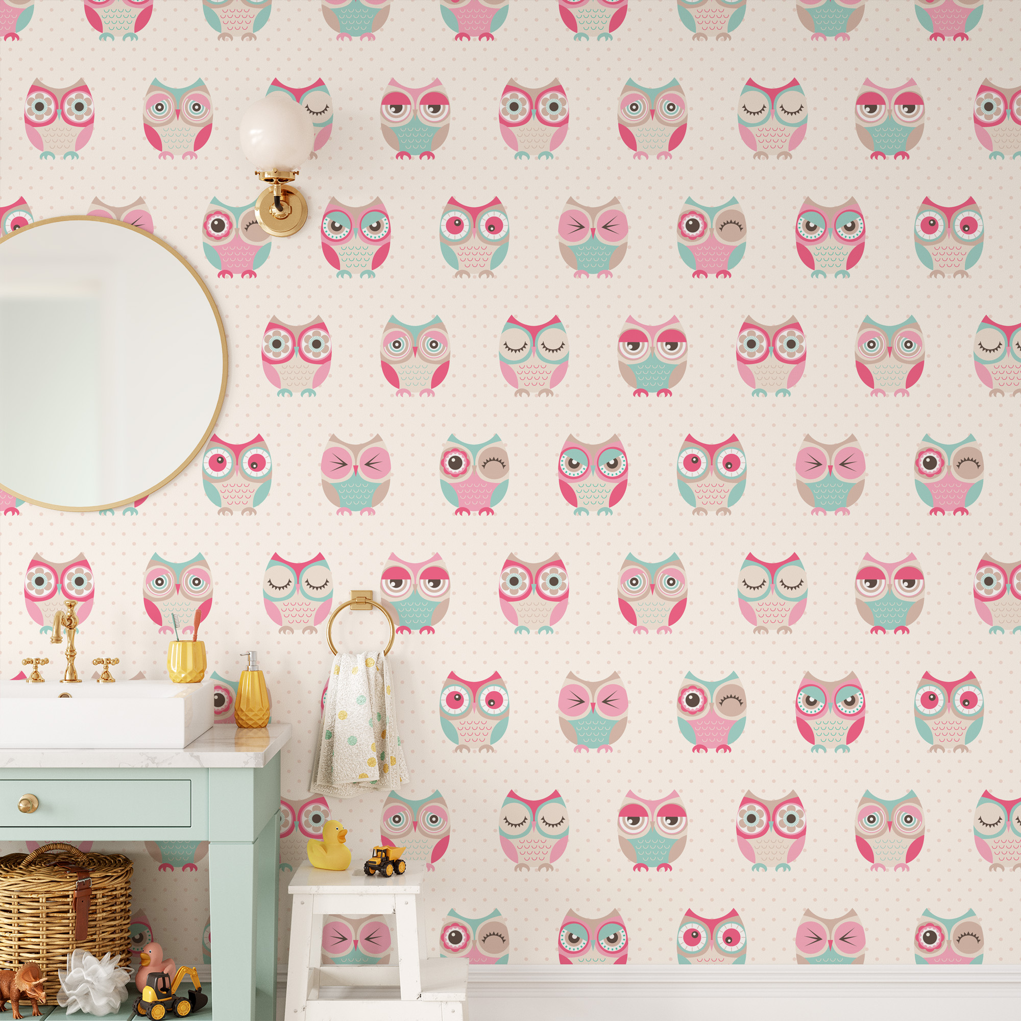 Whimsical Pastel Owl and Polka Dot Kids Peel and Stick Wallpaper, Cute Pink and Teal Nursery Wall Mural kids-0052